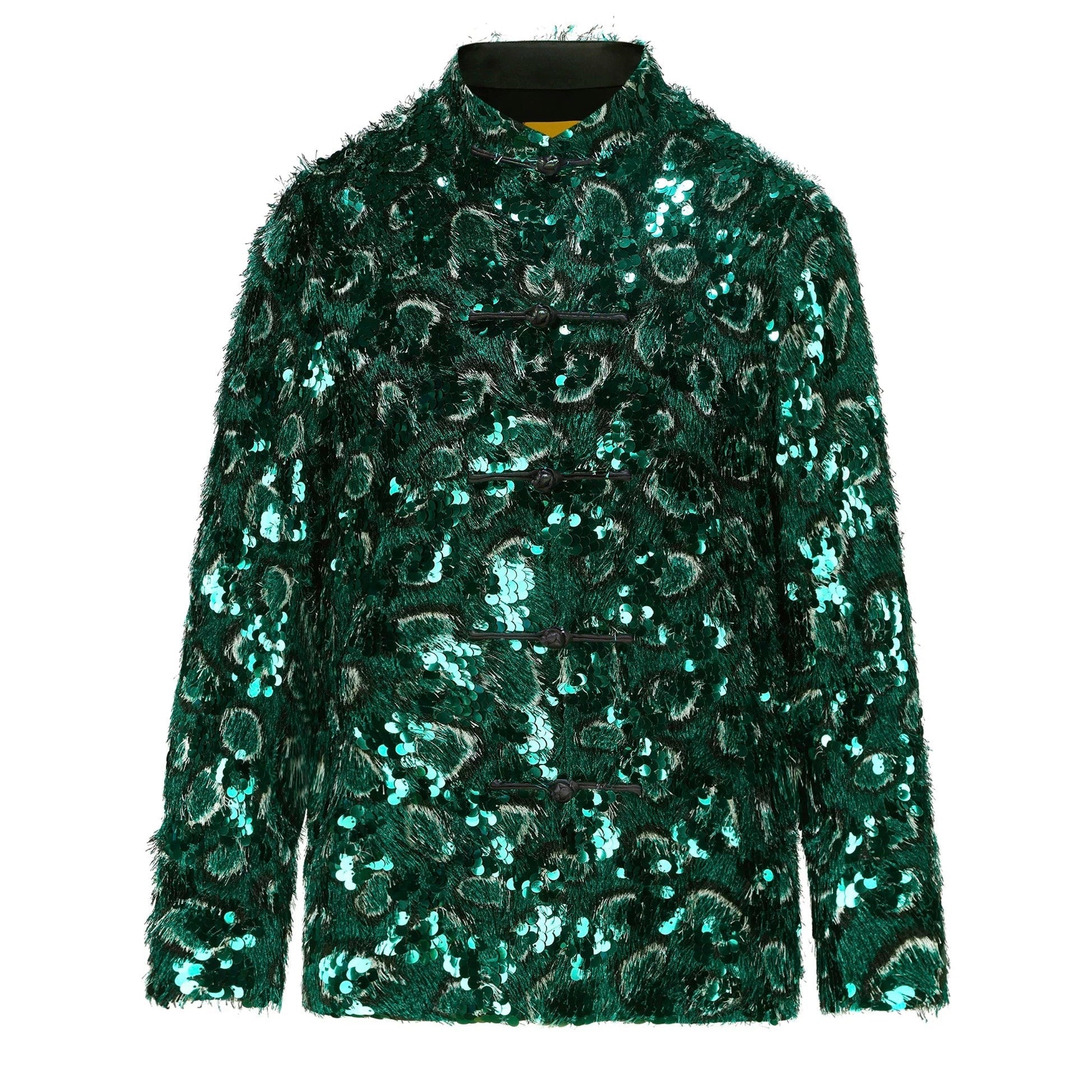 Évoquant l'élégance intemporelle, la blouse col Mao en sequin verte émeraude s'impose comme une pièce maîtresse de votre garde-robe. Sa teinte vibrante, scintillante à la lumière, sublime la silhouette avec une sophistication rare, créant une allure à la fois audacieuse et délicate. Cette blouse incarne l'art du raffinement, invitant à des occasions où chaque instant se transforme en un moment d'exception.